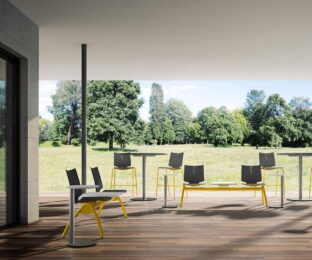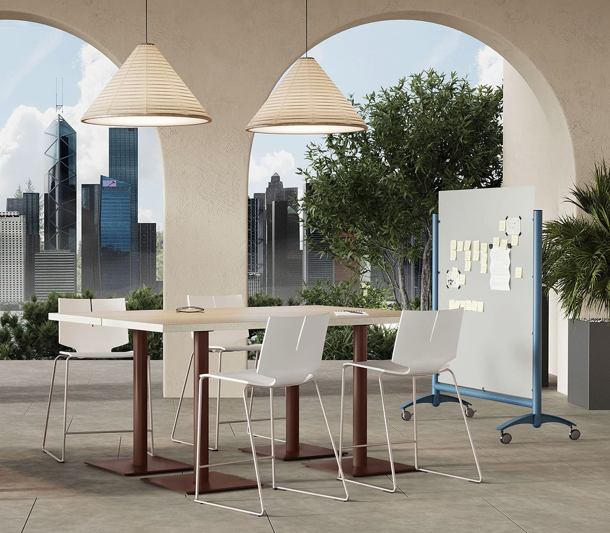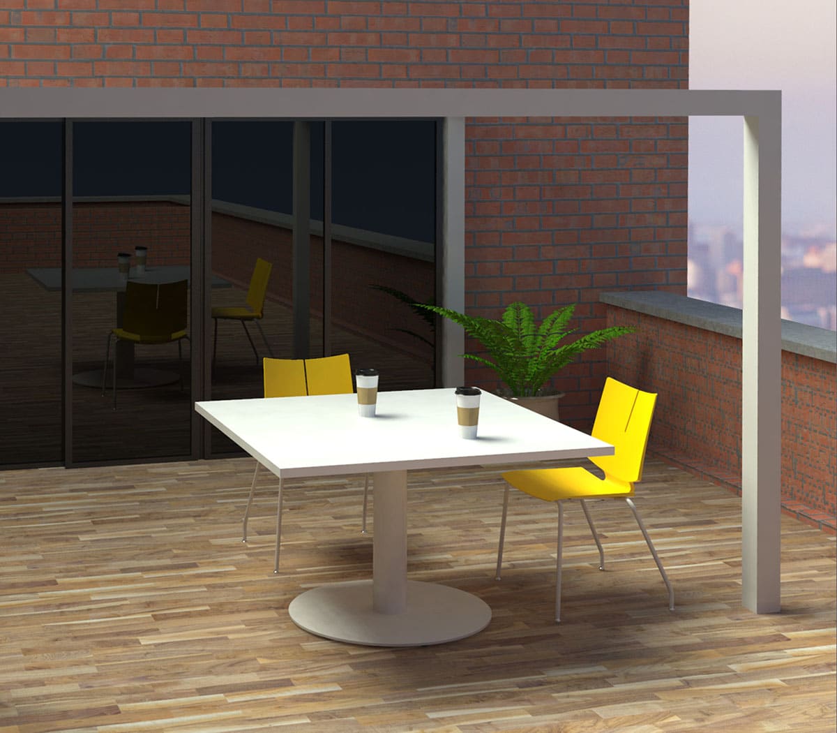 Quality tables and chairs used in pavilion style patios remain at the ready for spontaneous meetings or heads down work. Unlike your typical lawn chairs, choosing products that are made for work will help with ergonomics and productivity. Versteel’s Pavilion line up can be kept outside under shelter and out of direct sunlight.