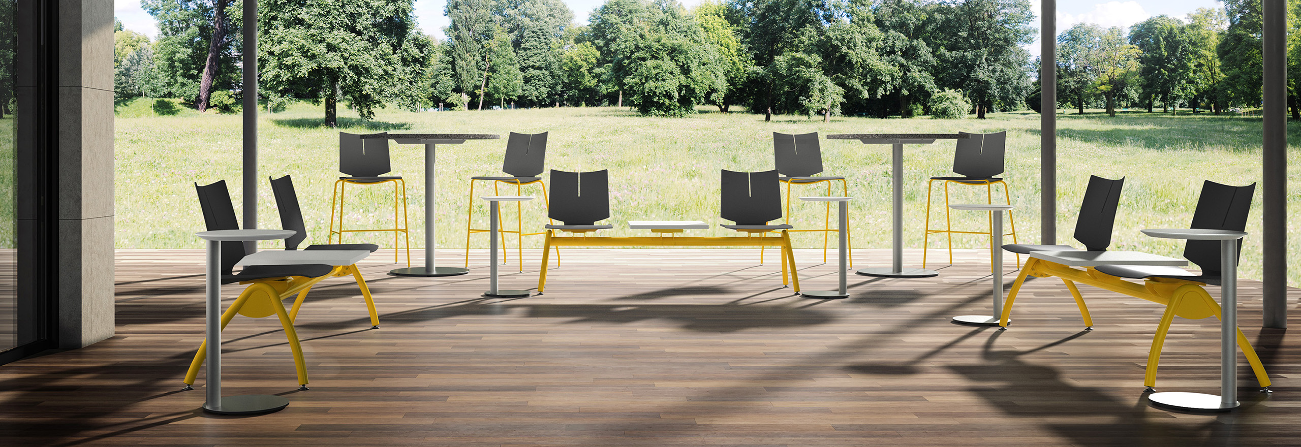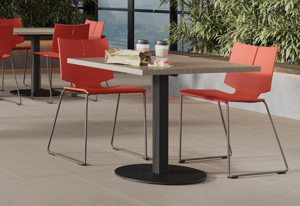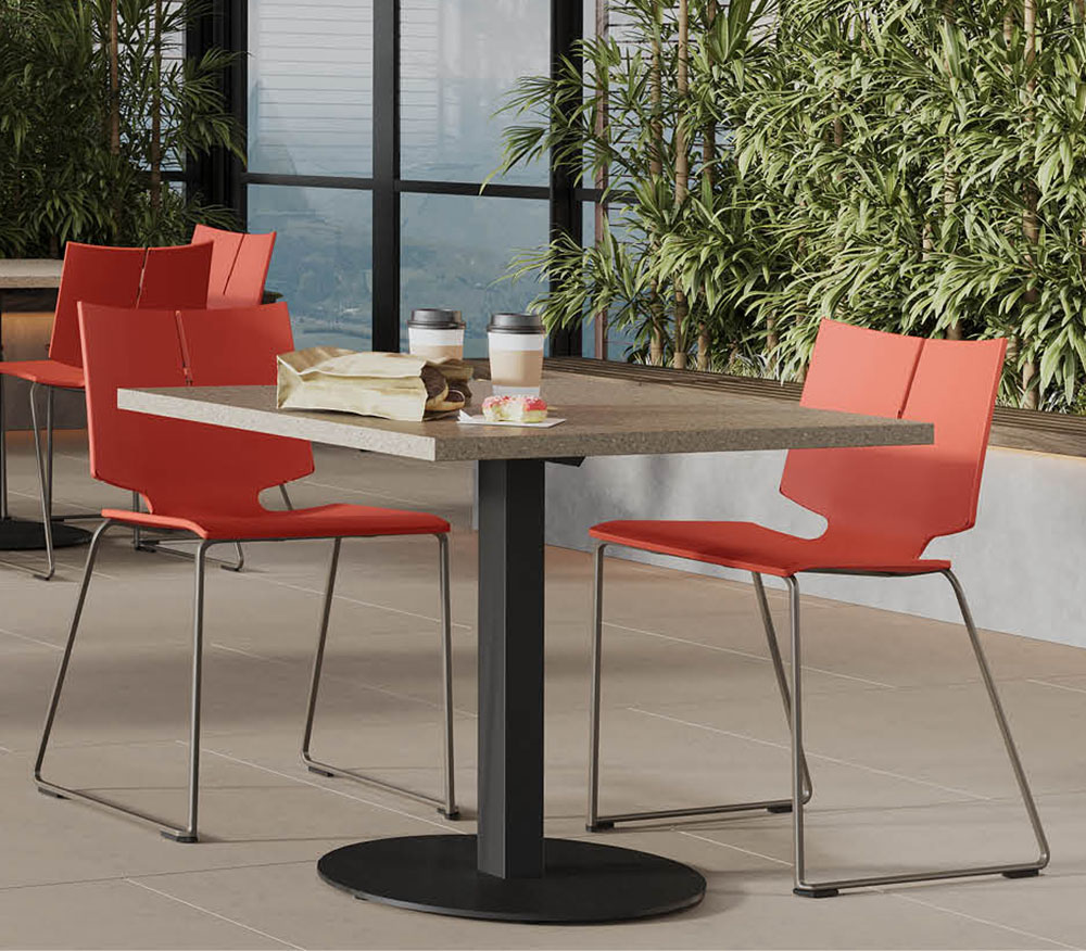 Options abound for exterior use. Enduring, economical powder coated worksurfaces marry the benefits of wood and metal while also providing more specification flexibility. Other top materials for long-term outdoor use include stainless steel and Krystal Cast. For short-term Pop-Up applications, certain laminates may be considered. Though all Versteel Pavilion and Pop-Up seating can be specified without fabric, adding a seat cushion with outdoor fabric is an option. For more information on applicable materials, contact Versteel Customer Service.