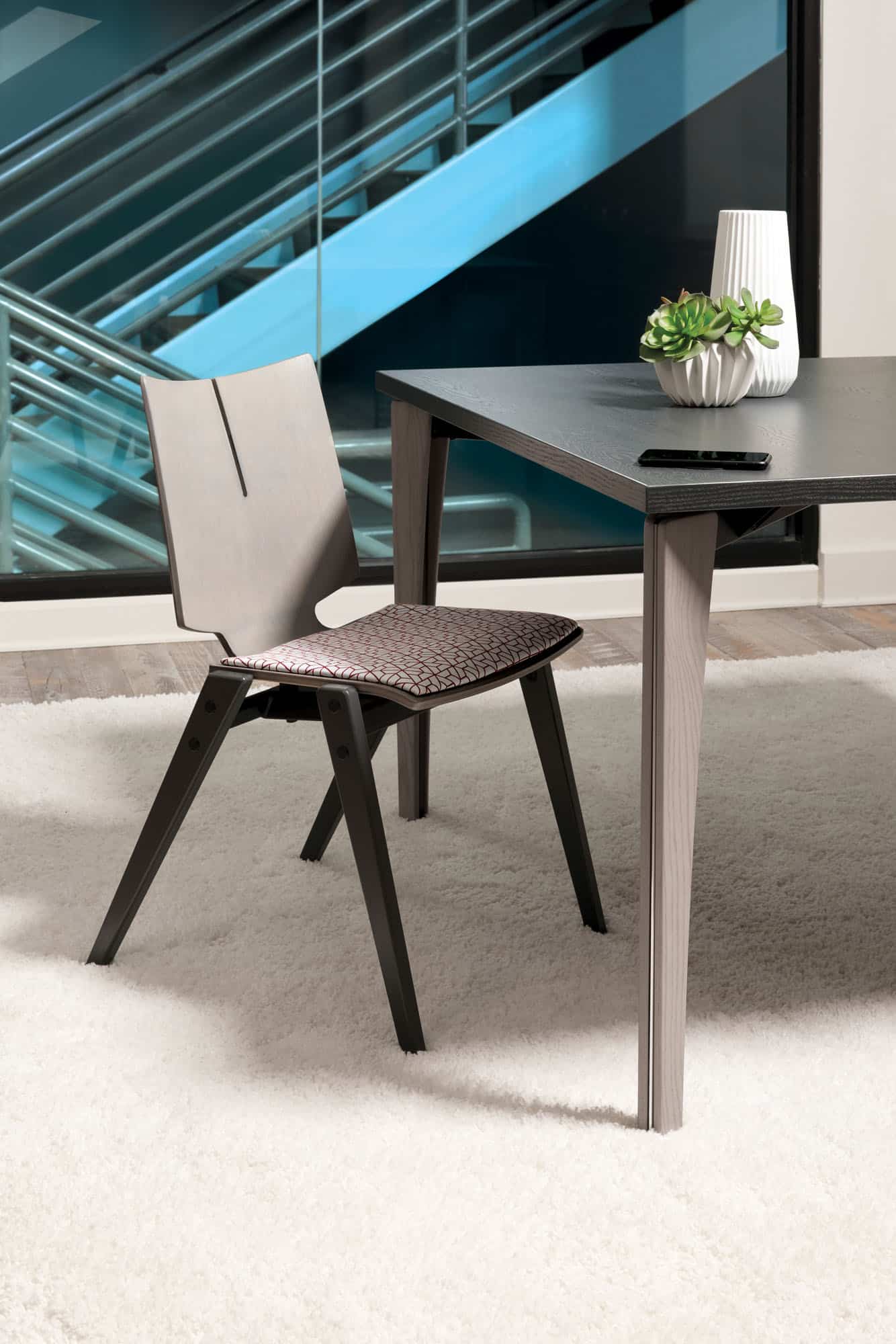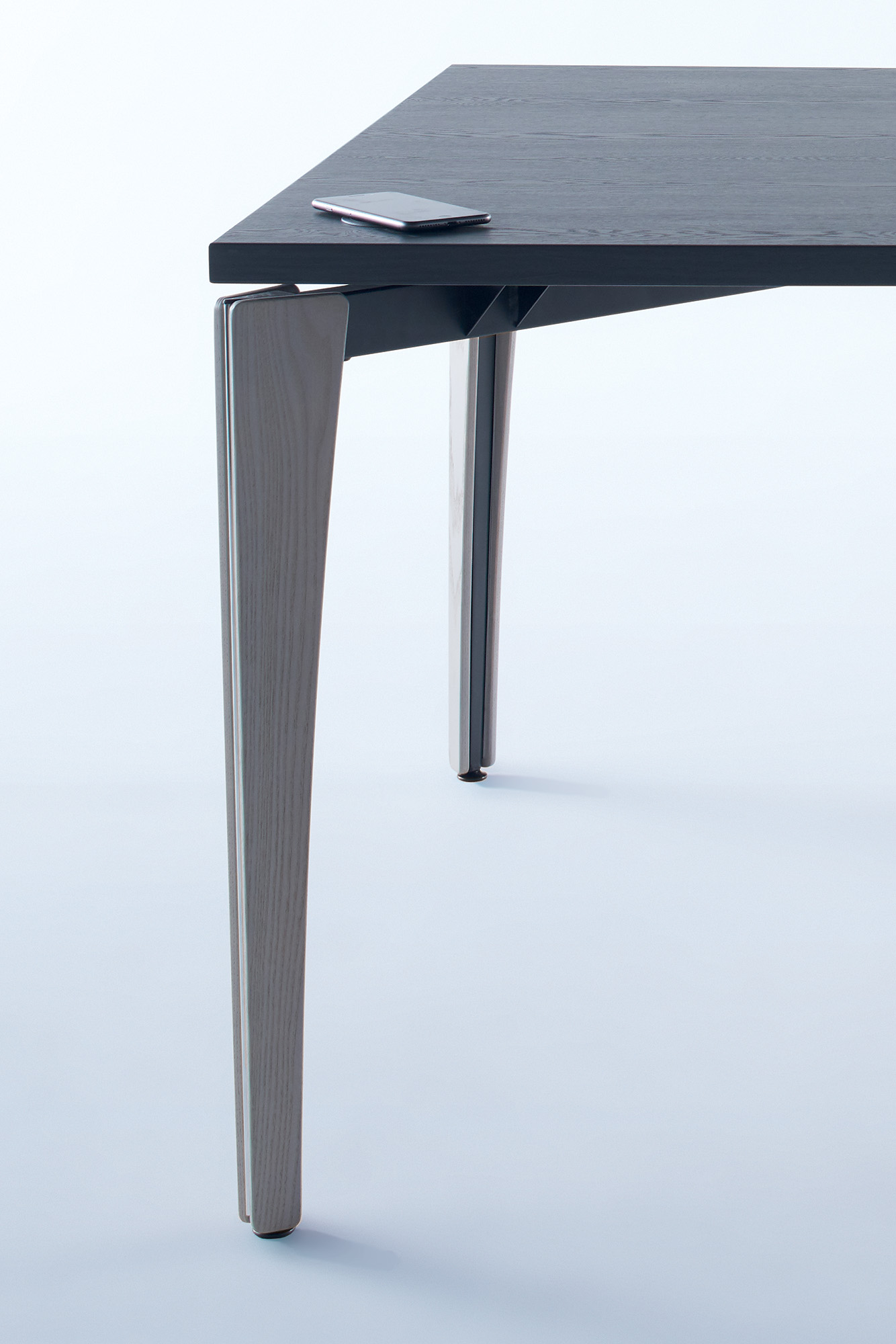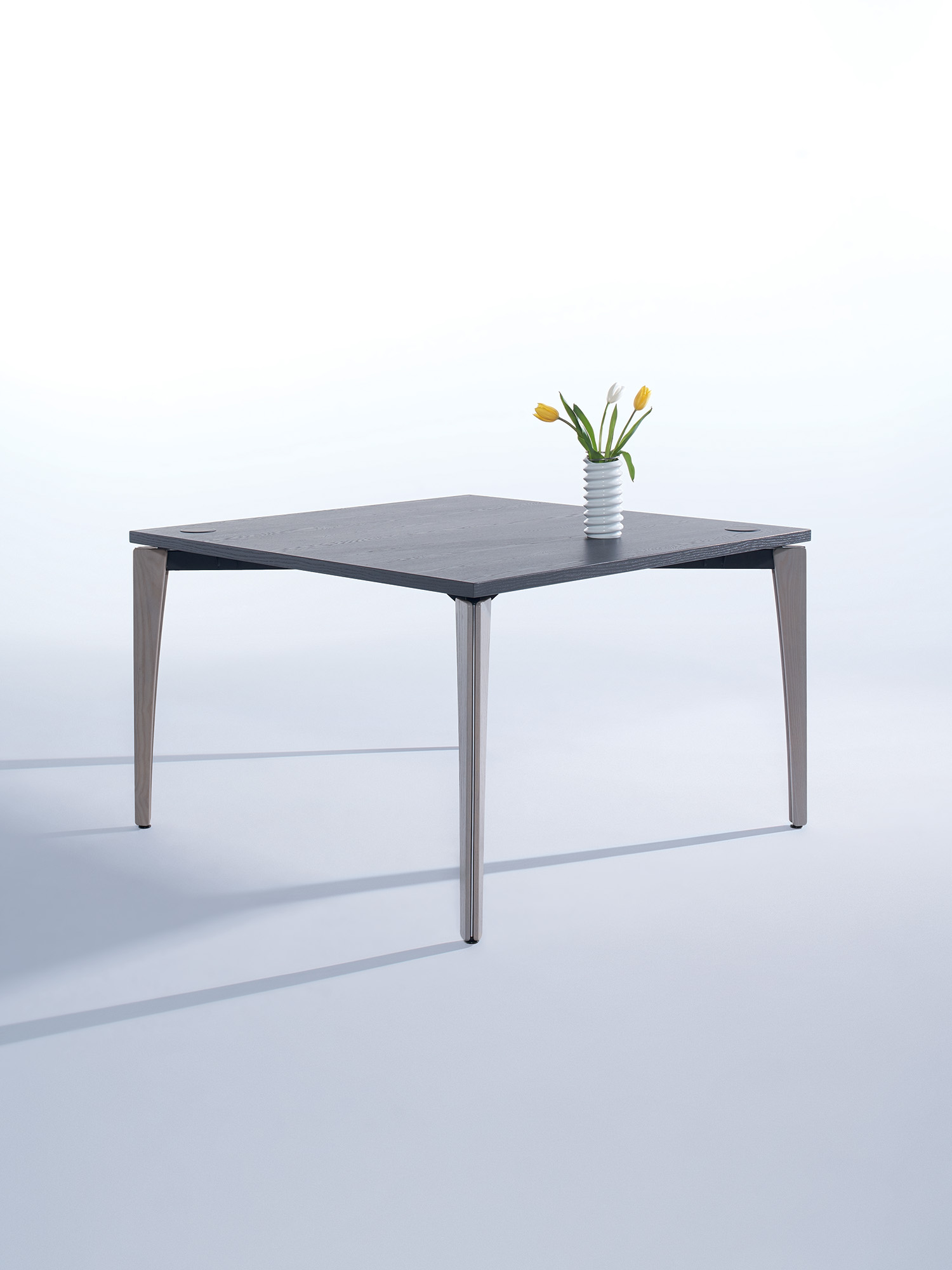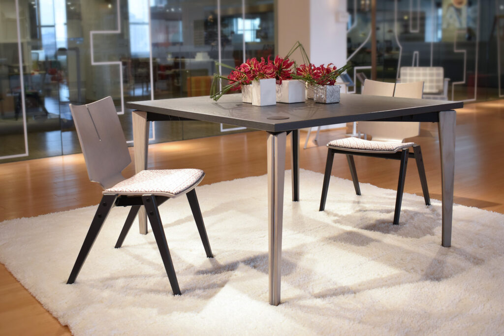 Arvo adds refined productivity to gathering, studying or meeting areas. Tapered wooden legs conceal a durable triangular frame, as hinted at by the elegant metal reveal. Add charging with various options, including the wireless V Charge.