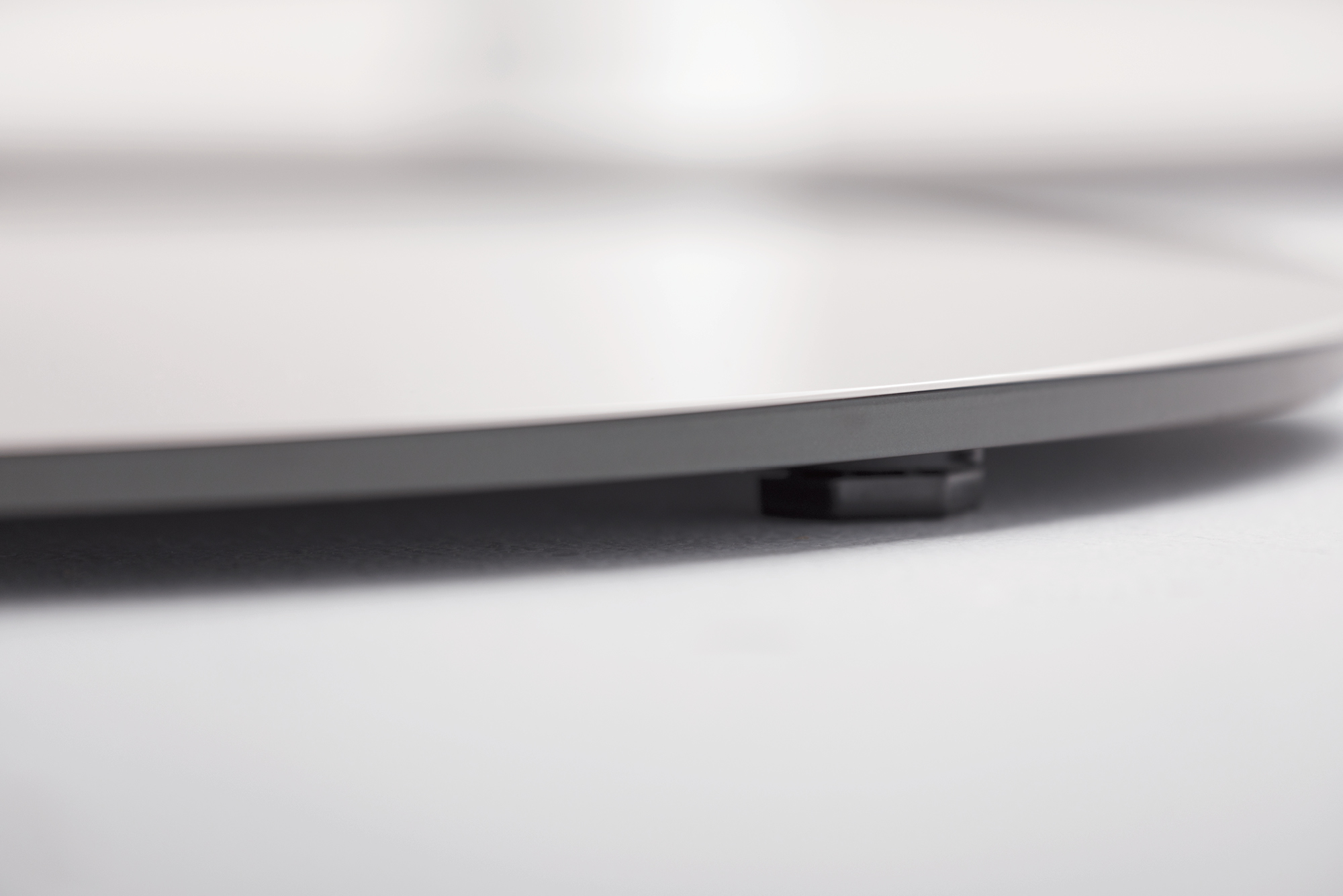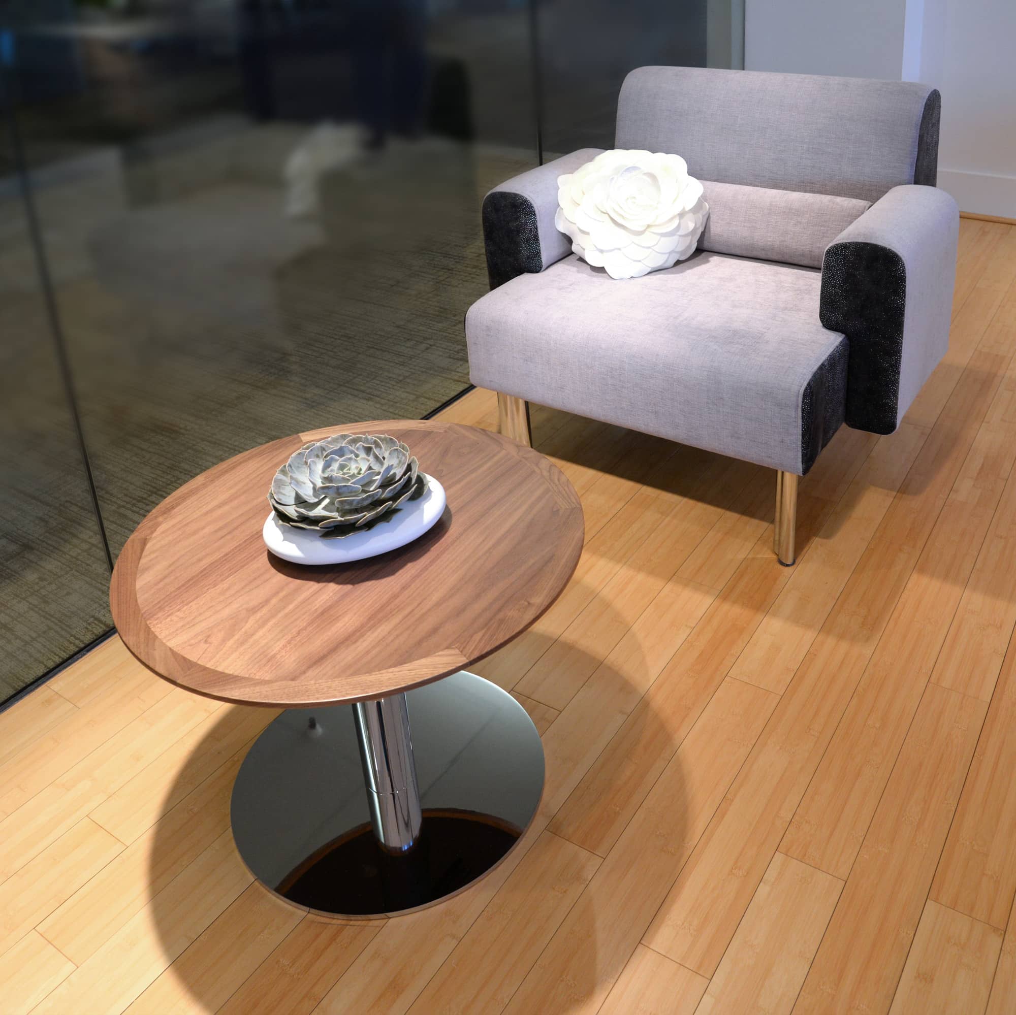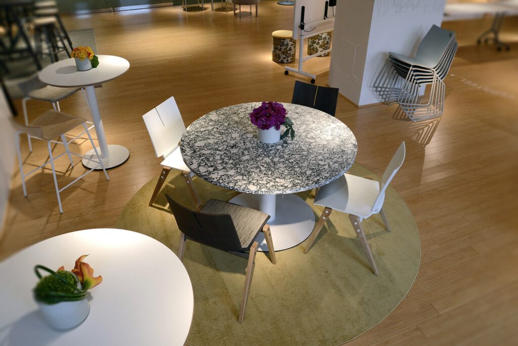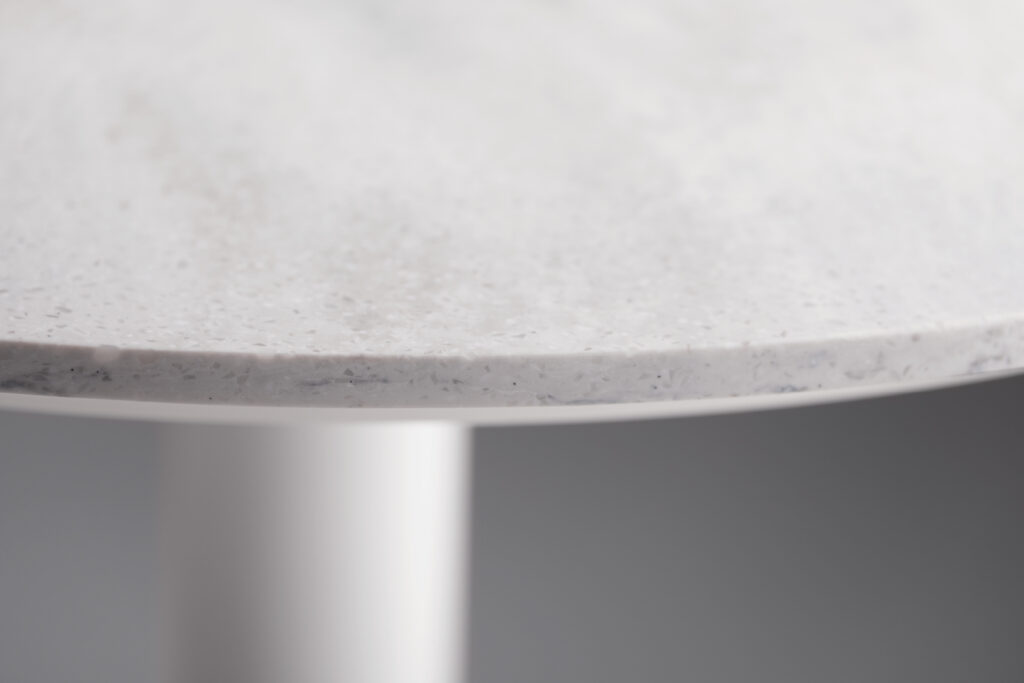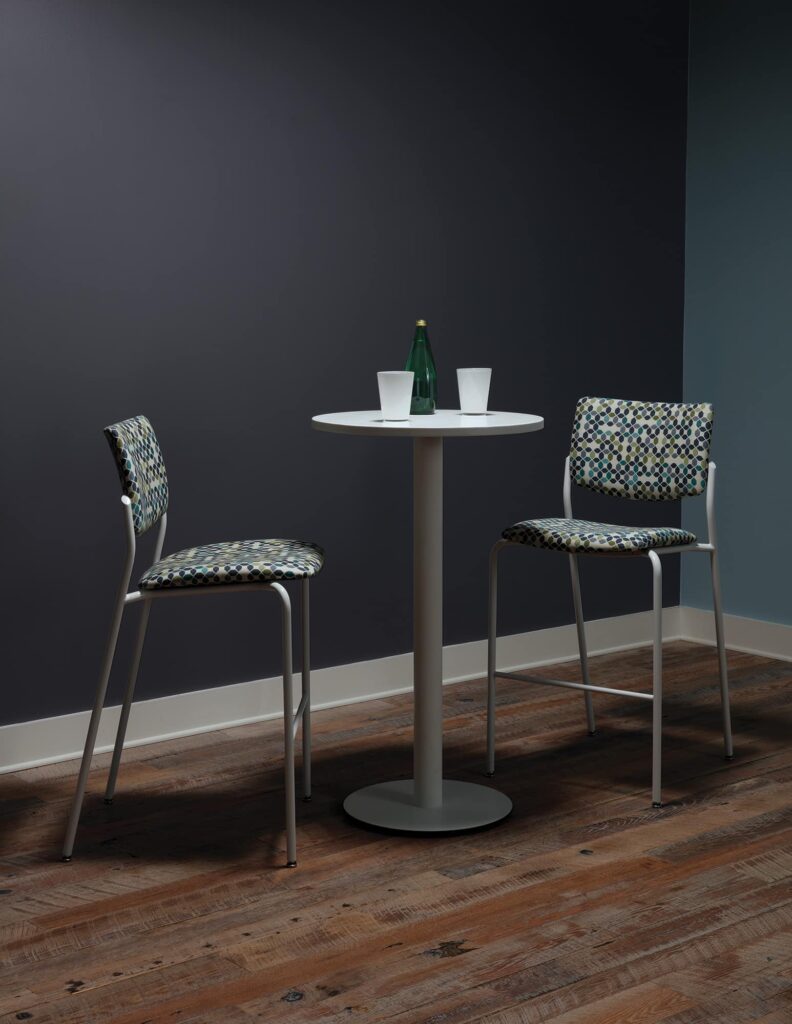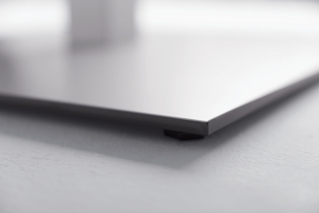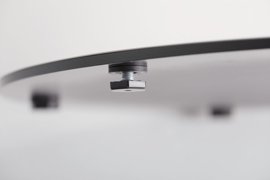 Deci won’t wobble, wiggle or waver when put to the test in demanding and diverse environments. Underneath the extremely slim profile and delicate appearance is a laser cut, solid steel plate which provides stability and balance. Adjustable glides are standard for leveling in uneven environments.