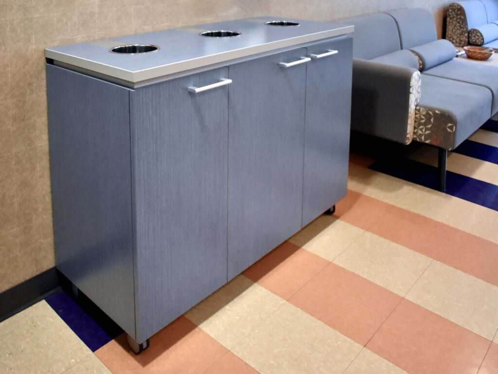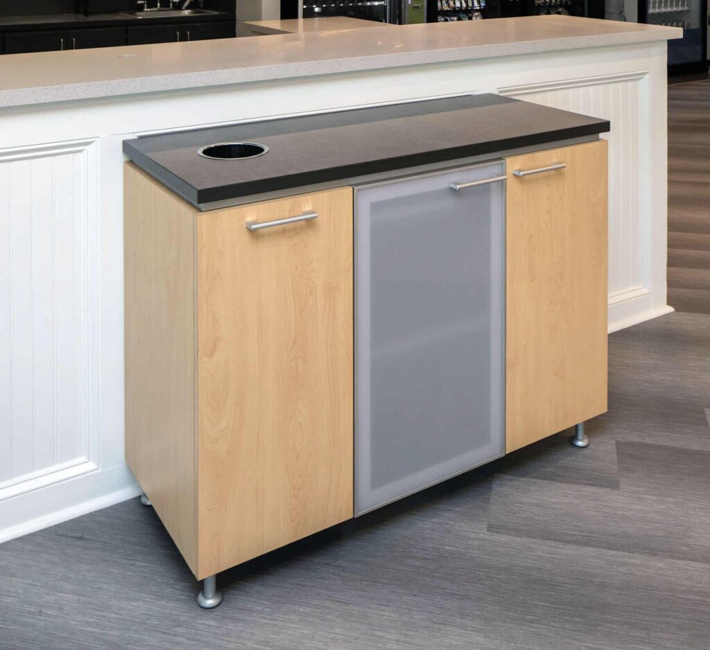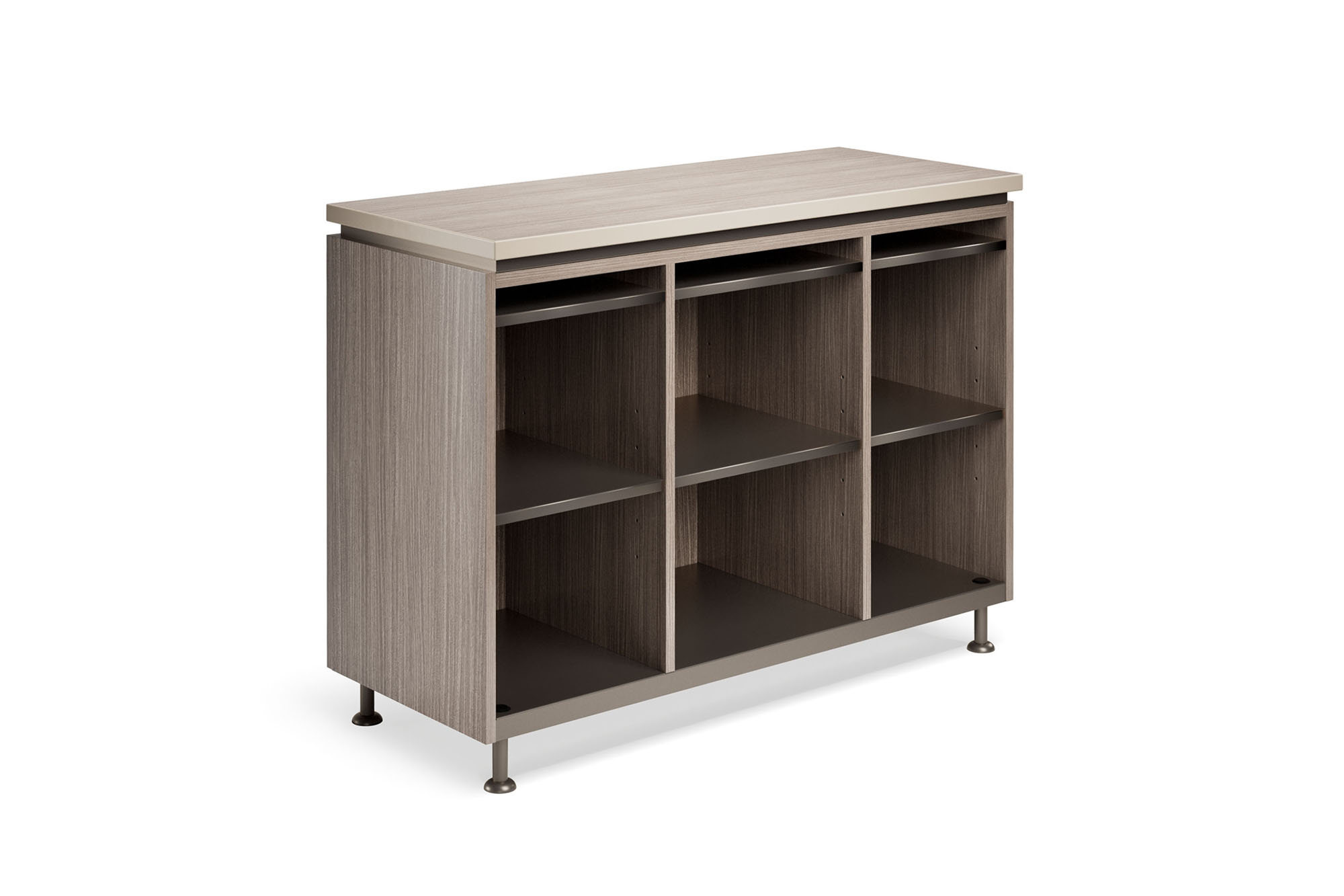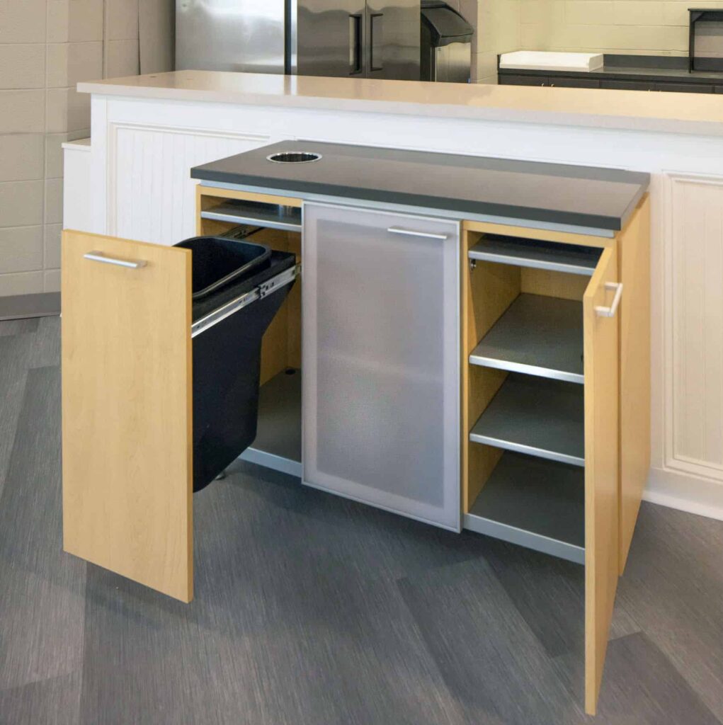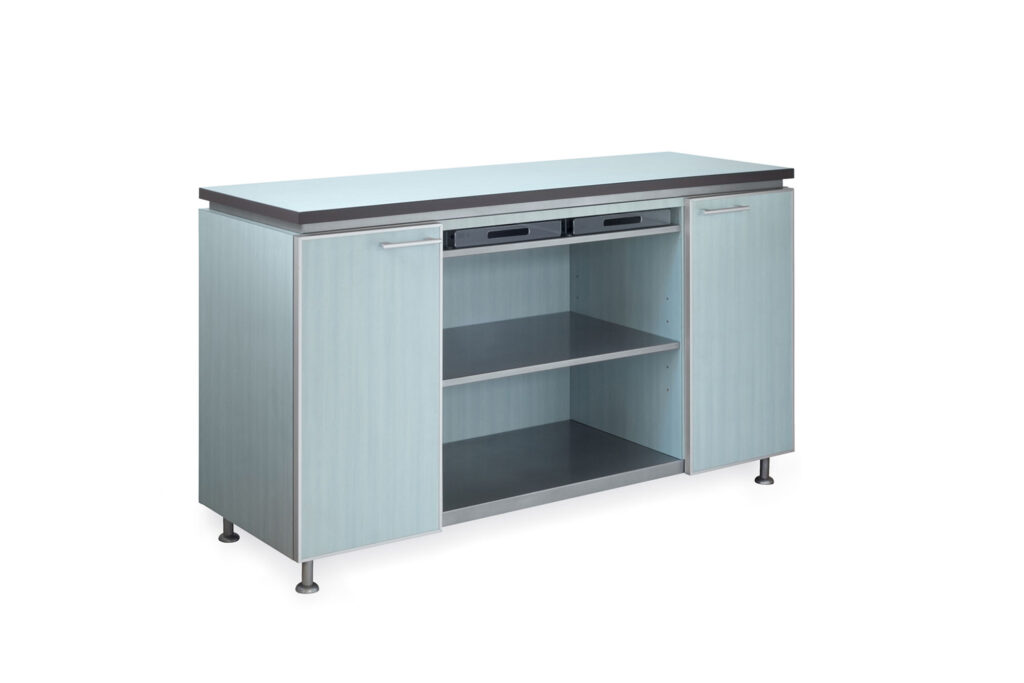 Entourage adds a practical finishing touch to community and collaboration spaces. Storage cabinets come in a variety of open shelves/door combinations. Recycling cabinets provide access to hidden compartments and are customizable with recycling plates.