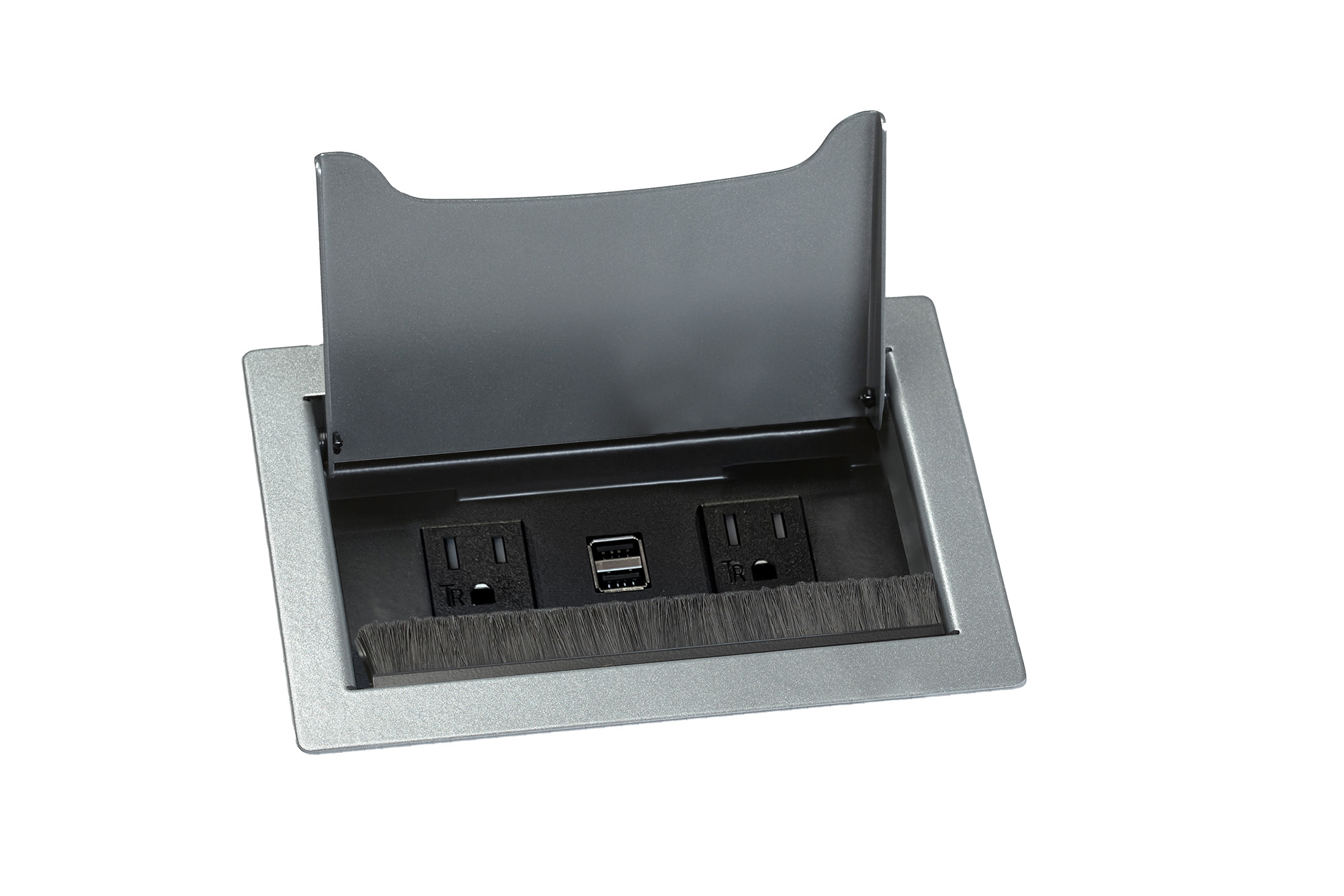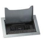 Inset unit with flush mount bezel. Specify bezel in any Versteel powder coat. Has power outlets, USB and open ports.